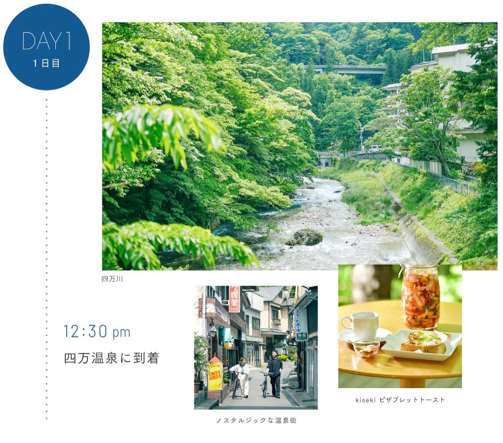 四万温泉へは車はもちろん、東京駅から直通バス( 詳細はこちら )も出ております。四万温泉に到着したら、まずはランチへ。 四万温泉の玄関口にあるLULUDの姉妹店「 森のカフェKISEKI 」や、ノスタルジックな温泉街には定番の蕎麦やとんかつをはじめ、群馬の郷土料理おっきりこみうどんや本格フレンチ、ハンバーガーなど、さまざまな種類の飲食店が連なります。( 四万温泉の飲食店ガイドを見る )