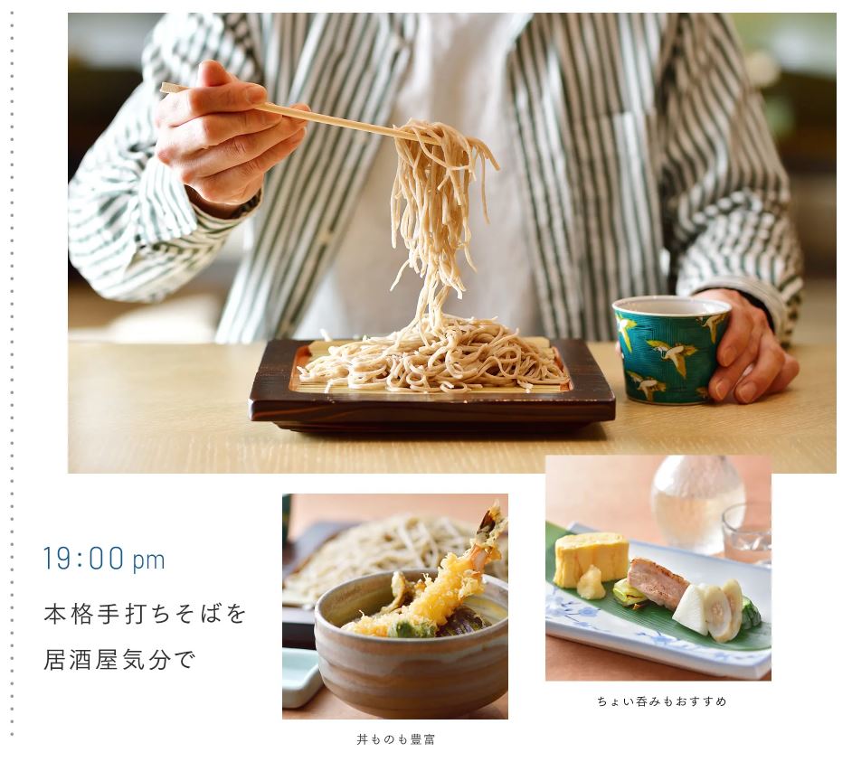 今日の夕食は、LULUDの一階に店を構える「 SOBA dining シマノネ SHIMANONE 」へ。老舗旅館「鹿覗きの湯 つるや」で総理長を務める「池田 正」による手打ちそばをご提供しています。旅館の本格的な味わいを居酒屋スタイルで気軽に召し上がってください。( SOBA dining の詳細を見る )