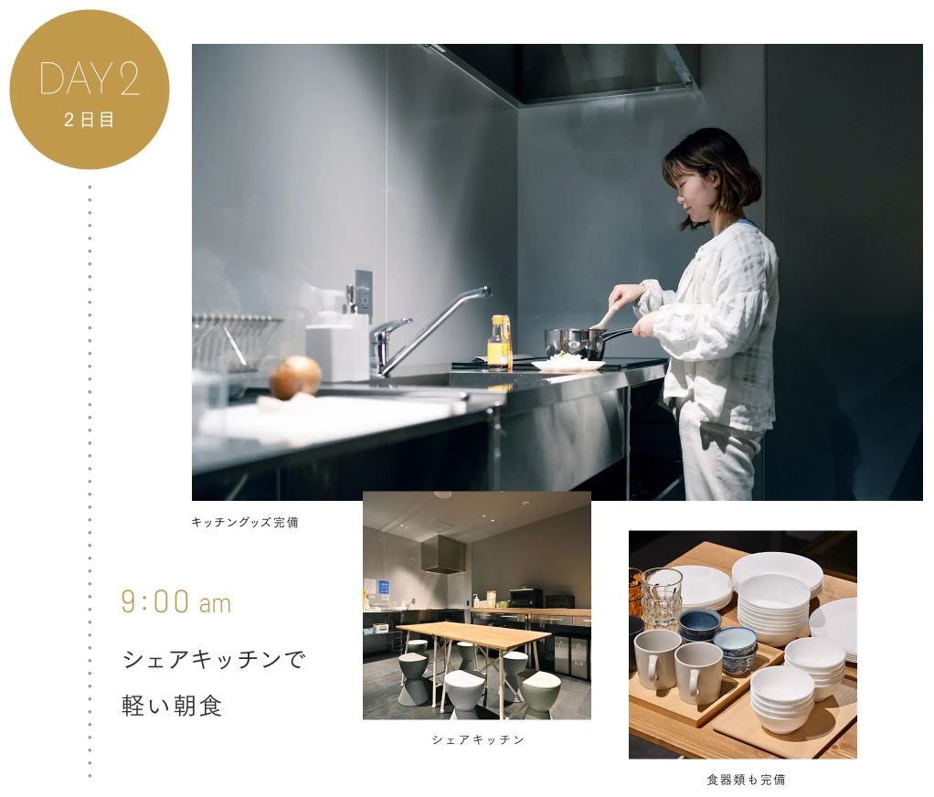 そんな方にも活用していただきたいのが、滞在型ホテルならではのシェアキッチンスペースです。調理道具や皿類、電子レンジ、ケトルなどが揃っておりますので、食材などを持ち込んで軽いお食事も作っていただけます。