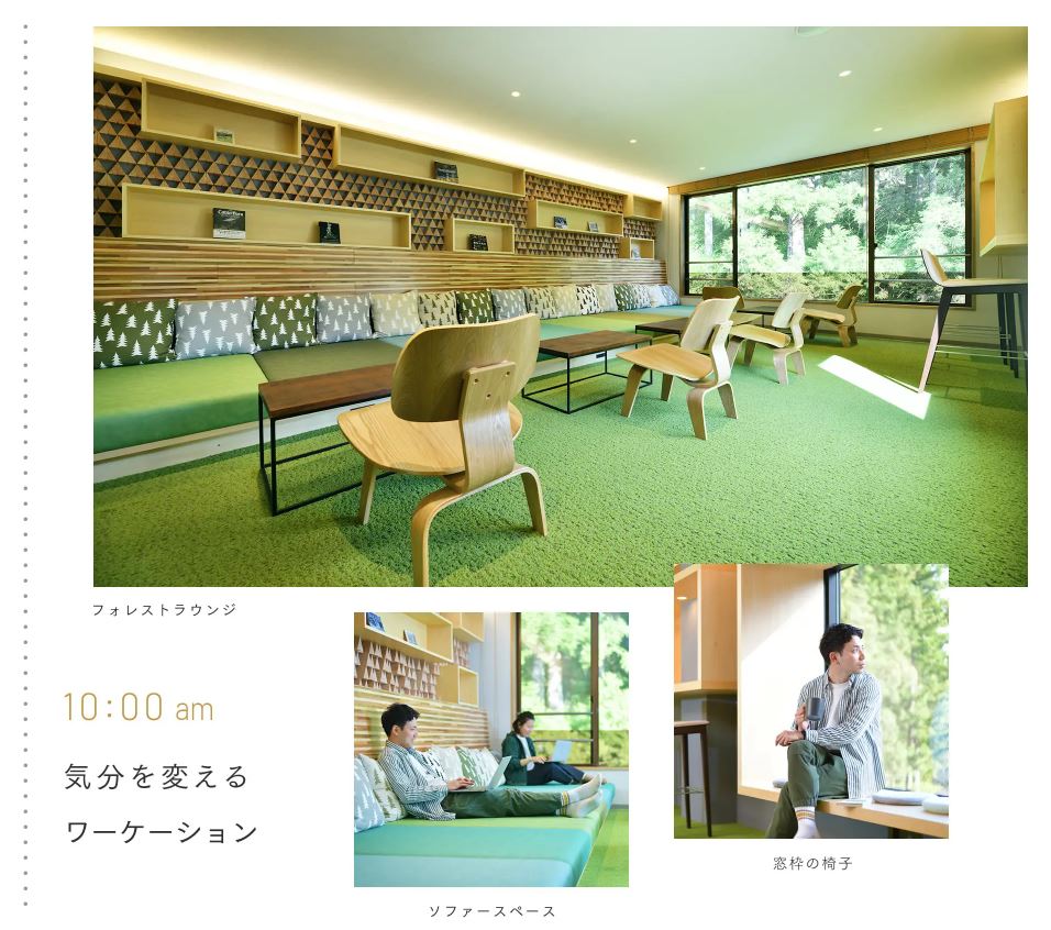グループでお越しのお客様のミーティングやお部屋以外での寛ぎスペースとして、ご宿泊の皆さまにご利用いただけるラウンジ。緑を基調とした空間には、足を伸ばせるソファースペースや窓枠が椅子になっているスペース、カウンターなど趣向を凝らしています。