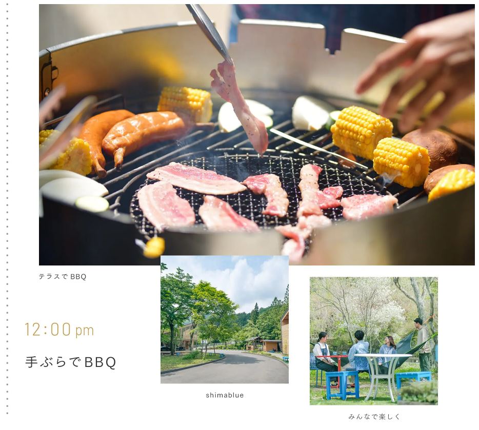 LULUDの姉妹館「温泉グランピング ShimaBlue」ではテラス席で本格的なBBQランチを楽しめるプランがあります。道具類の準備・片付けは無し!食材も、上州牛のカルビをはじめ群馬県産の野菜などのをご用意しておりますので、手ぶらでOK。外の風を感じながらいただくご飯は格別です。( ご予約はこちら )
