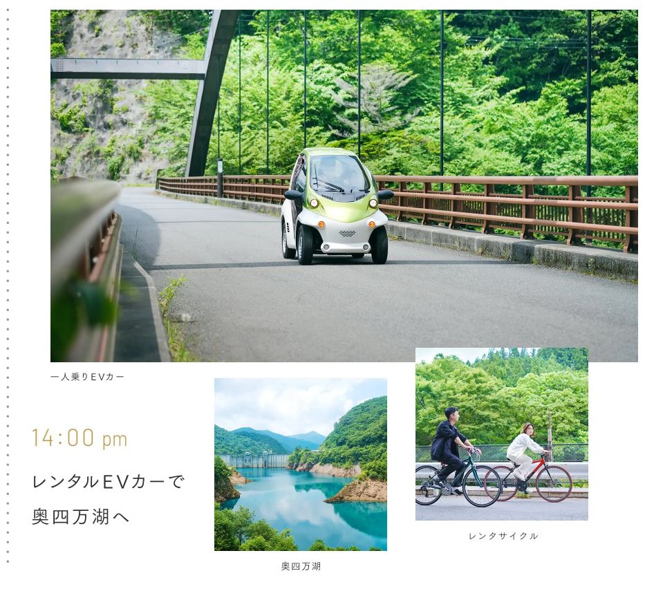 旅の締めくくりは、四万温泉の観光名所「奥四万湖」へ。周囲4kmある広大な湖は神秘的な水色が特長で、「シマブルー」と呼ばれています。LULUDでは一人乗りEVカーのレンタルもございますので、バスや電車で来られたお客様や一人乗りEVカーに乗ってみたい!というお客様にも気軽にお試しいただけます。( EVレンタカーの詳細を見る) 自転車の貸し出しもございます。( レンタサイクルの詳細を見る )