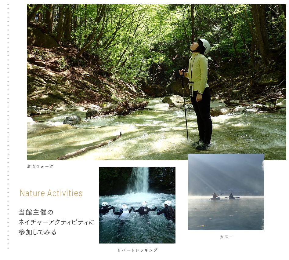 春には【清流ウォーク】、夏は【リバートレッキング】、他カヌーなど季節に合わせたこの地ならではのアクティビティを展開。お客様の思い出作りを全力でサポートいたします。