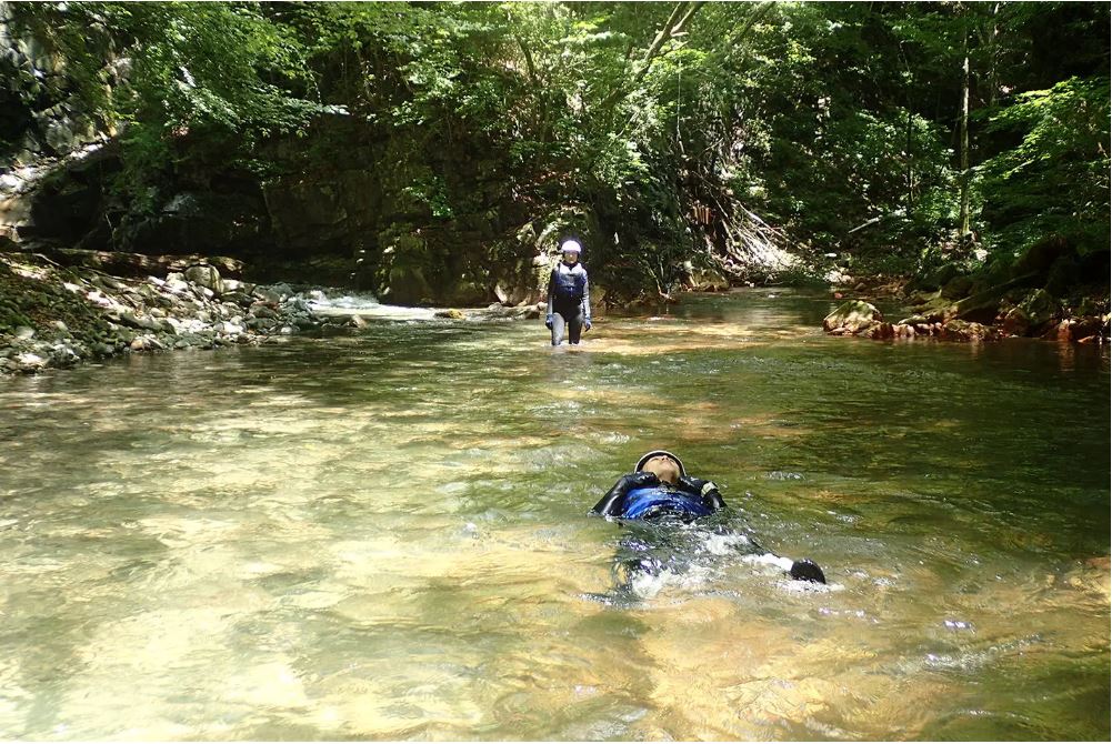 専任のガイドがお客様の体力に合わせながら無理のないツアーをサポートいたします。往復1キロぐらいの距離を歩ける方なら、どなたでもご参加いただけます。川には一部深い場所はありますが、ほとんどの場所が膝下程度の足のつく浅瀬を進みます。泳げない方でも浮力のあるライフジャケケットを着用していただきますので、溺れる心配はありません。ただし、体験場所は自然の川ですので、滑りやすい場所や流れが早い場所があることをご理解のうえ、お申し込みください。