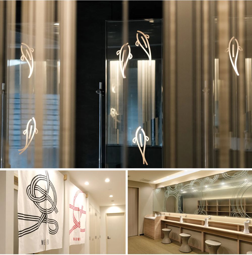 館名ロゴや各種サイン、キーホルダーに至るまで「ナリカタデザイン相談室」に、トータルにデザインしていただきました。幻想的に輝く大浴場のアートミラーにも、ご注目ください。