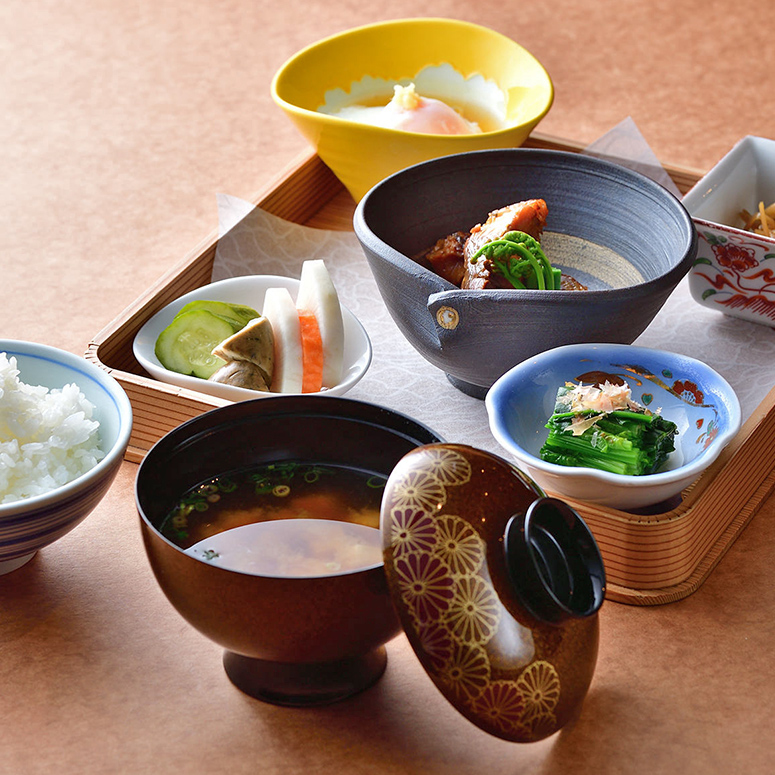 地元素材を活かした健康的な和朝食をご提供。場所は朝夕共にSOBA dining シマノネです。