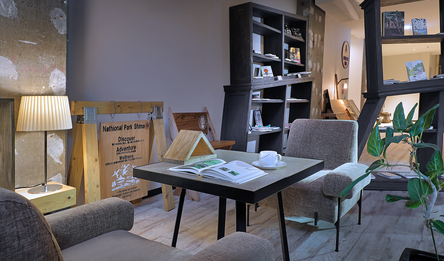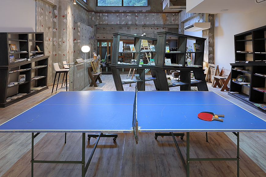 24H利用可能/「人生のひとやすみ」をテーマにしたライブラリー&卓球コーナー。本棚に置いてある本は全て販売しております。