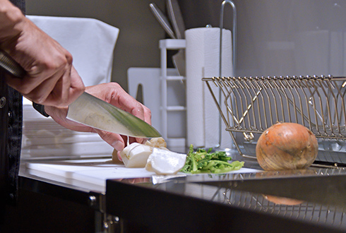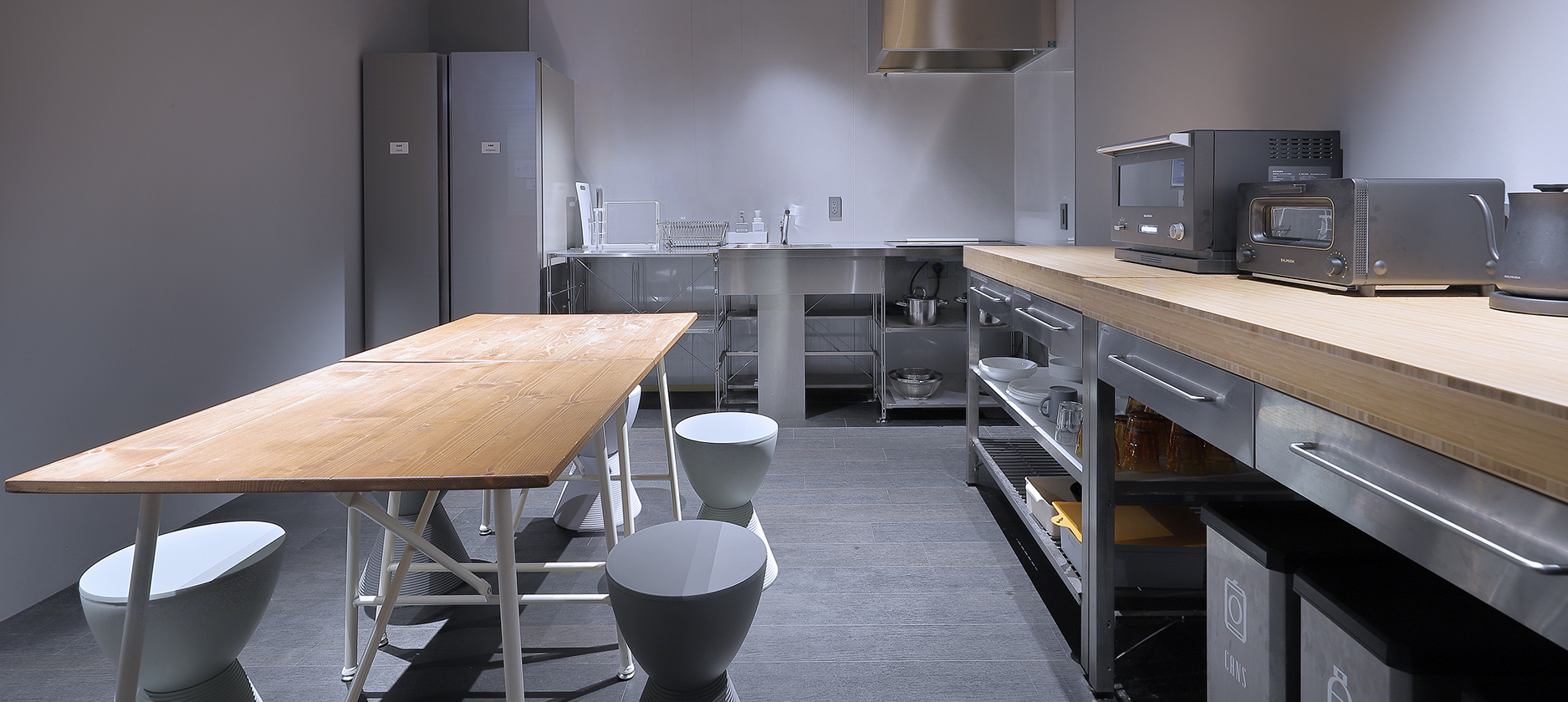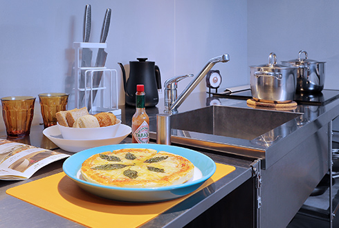 調理器具を一通り備えたシェアキッチンがございます。食材と調味料を自前でお持ちいただければ、ご自身で料理していただくこともできます。