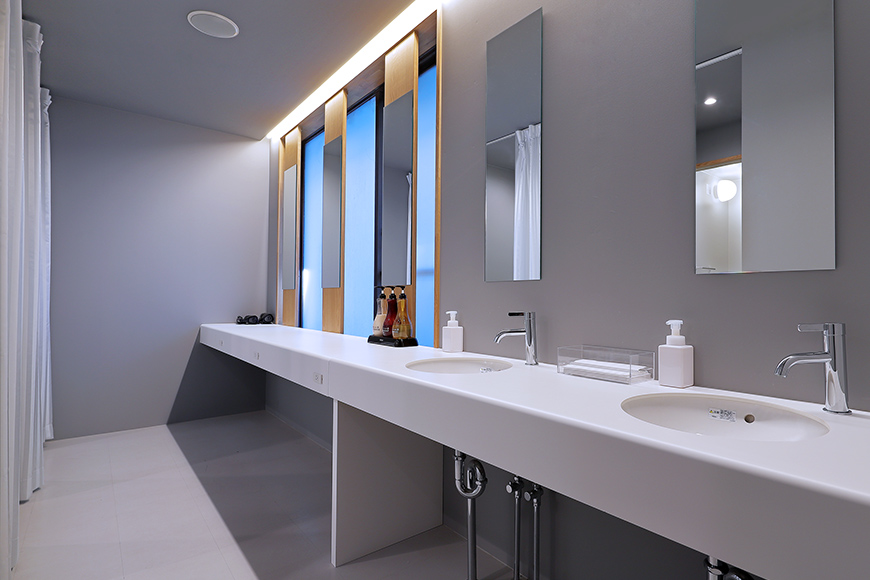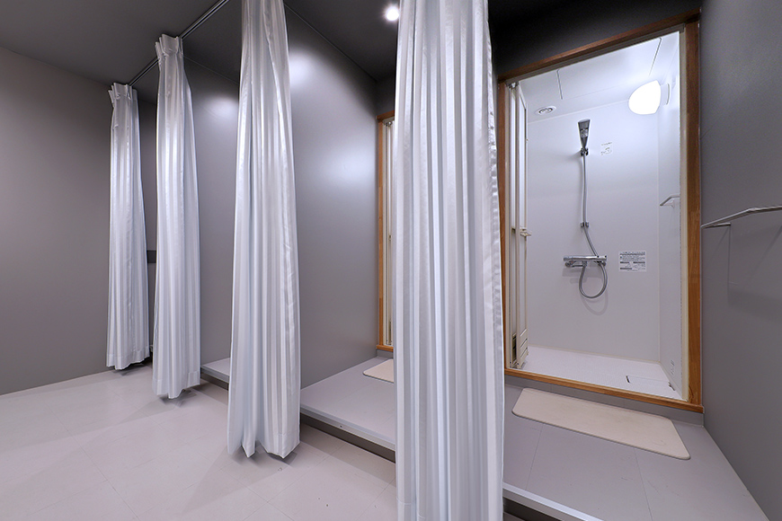シャワールーム(男女別)ではシャンプー類、ドライヤーが使用可能。