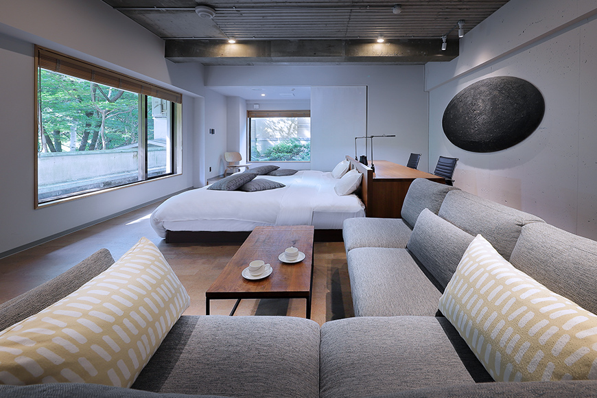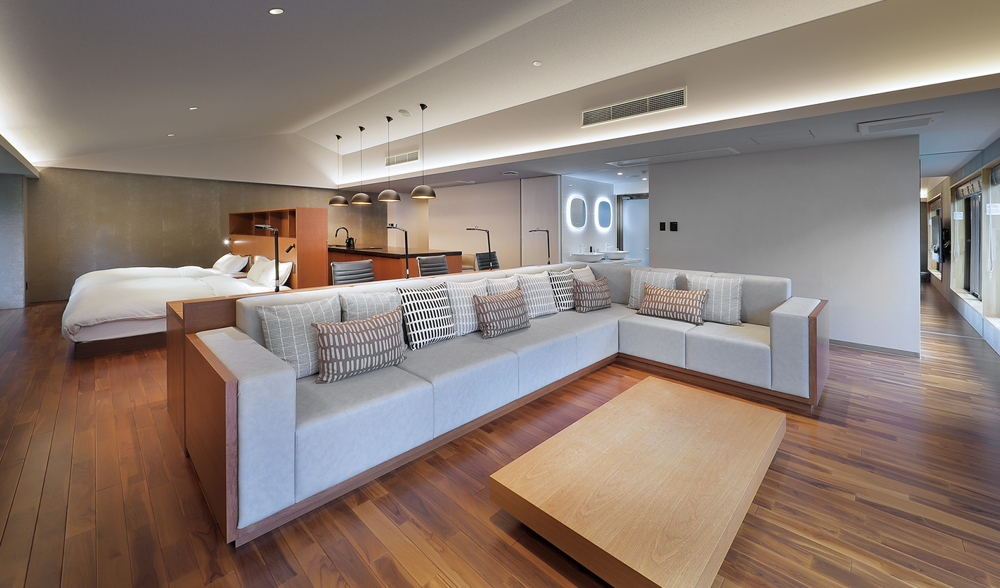 特別仕様の最上階ペントハウス 定員1〜2名SHIN湯治ホテル〈 LULUD ルルド 〉の最上階に特別仕様のペントハウスが完成しました。贅沢な空間を楽しみたい方はもちろん、長期滞在でのワーケーションや創作活動に集中したいアーティストの方々にも快適にお過ごし頂けるお部屋です。ゆったりと広がるリビングには、四万の森を眺める広々したデスクの他、専用のアイランドキッチンを完備し、石造りの専用風呂やビックサイズのソファーなど、室内でオンオフの切り替えができる設計になってます。 ミニマルデザインですので、使い方は思い思いに。こちらの”ペントハウス”をCEOの休憩スペース兼ミーティングルームとしてご使用いただき、下のフロアに社員皆さまでお泊まりいただく、会社の研修旅行の拠点としてもおすすめです。自然豊かな環境のもとで、新たな発想を生み出すチームビルディングに役立ててください。