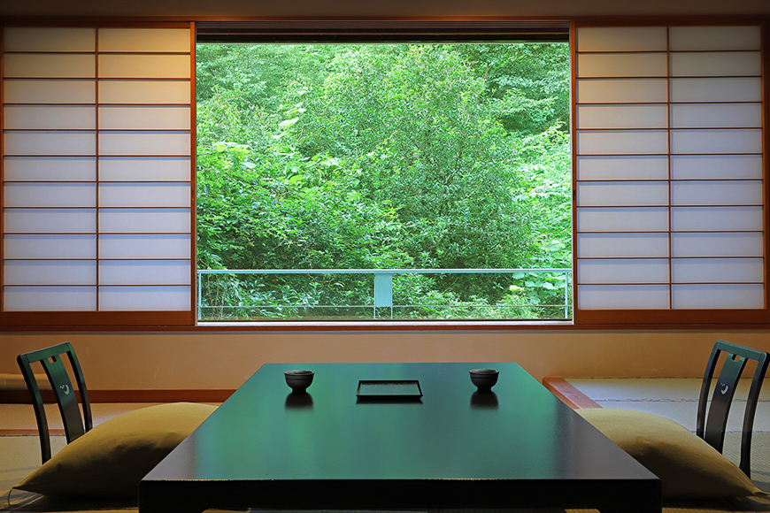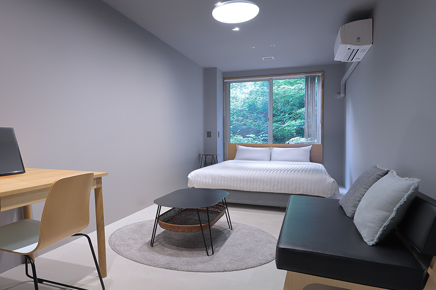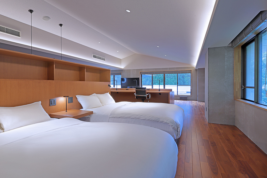 風が吹き抜ける専用テラス 定員 1~2名四万の森の風が吹き抜ける開放的な”テラスルーム”。デスクとベッド、窓、テラスを一直線に並べ、四万の森を眺めるために設計された気持ちの休まるお部屋。デスクにはテーブルライトとコンセントの差し込み口を設けておりますので、自然を間近に感じながらワーケーションステイにもおすすめです。トイレとクローゼットも空間をゆったり使い、長期滞在にも対応できます。 *バリアフリーに対応しておりますので、車椅子でもご利用いただけます。