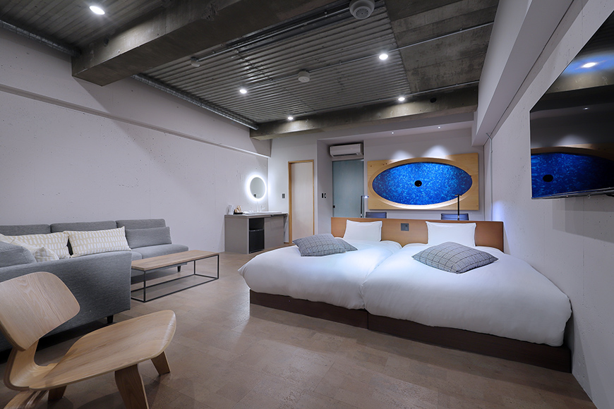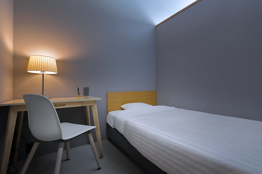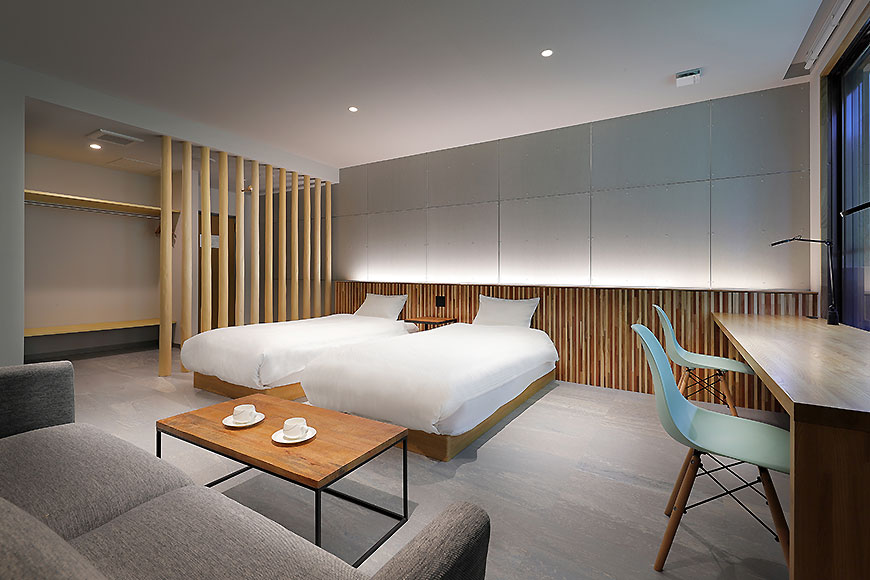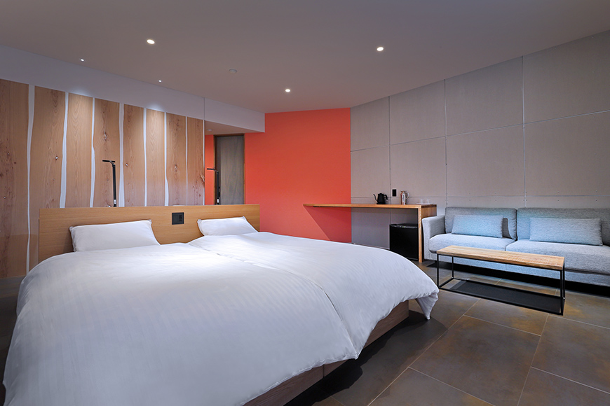 広さ 19.5㎡/定員1〜2名モダンでシンプルな空間にタブルベッドとソファー、デスクをレイアウトしたミニマムなゲストルームです。お泊まりの人数(最大2名)に限らず部屋料金が固定となるルーム・チャージ方式がベースとなりますので、カップルでのご利用ならリーズナブルに、お一人でのご利用であればゆったりと過ごしていただけるお部屋です。