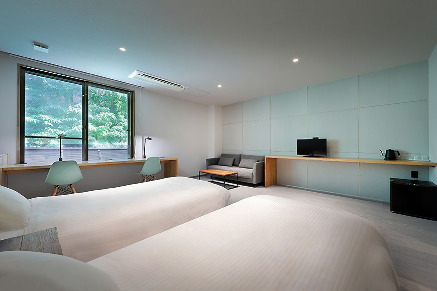 四万の森をイメージしたミニマルデザインルーム 定員 1~2名整然と並ぶ杉林が広がる四万の森をイメージしたその名も”フォレストルーム”。広々とした1Rにツインベッドとソファー、カウンターテーブルを備えた2名様でもゆったり過ごしていただけるお部屋です。ミニマルデザインの中に”フォレスト”を感じていただける装飾をプラスし、大きめの窓は四万の森がアートのように飾ります。”フォレストルーム”タイプは全室をご用意し、それぞれ種類の異なる小鳥たちが、皆さまをお迎えいたします。