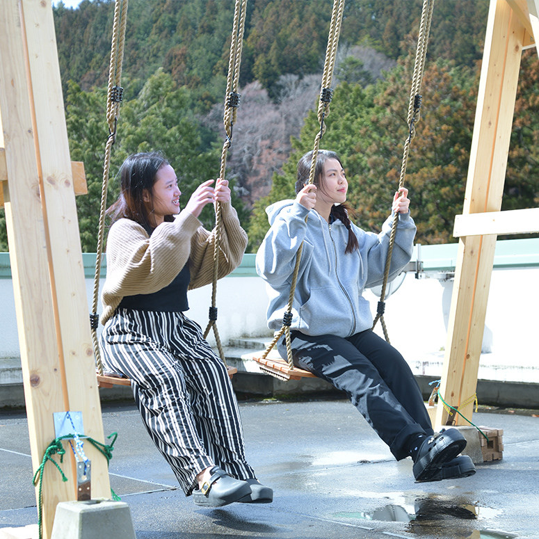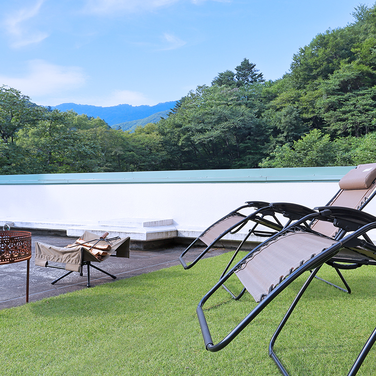四万温泉の自然を眺められる大きな窓に屋上テラス。山間部の四万温泉ではなかなか見ることのできない開けた空を独り占めできます。テラスにはブランコをご用意しております。夜には星空を見ながらのんびりご体験できます。
