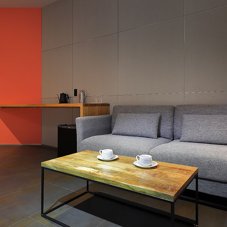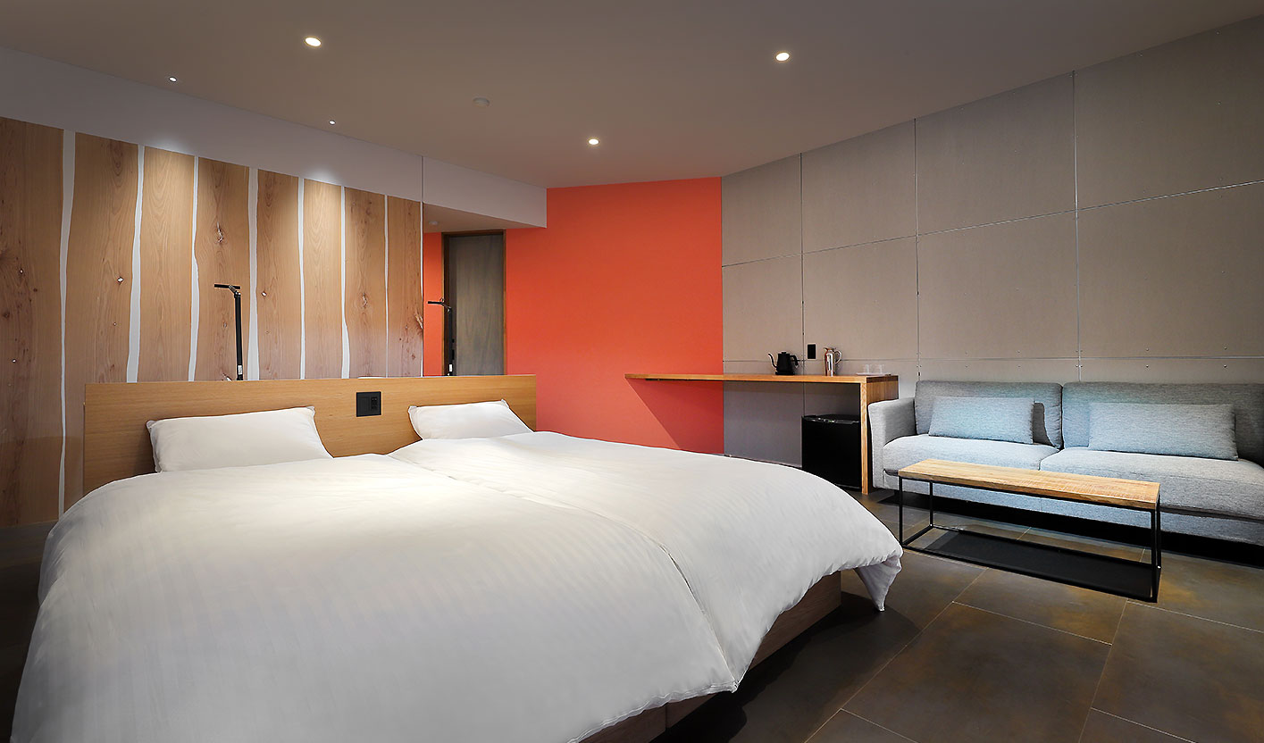 1面ポップなカラーを施した壁と木目調の壁が、シンプルかつスタイリッシュなお部屋。四万の森を眺めつつワ―ケーションするもよし。テレビを見るもよし。