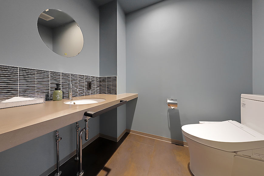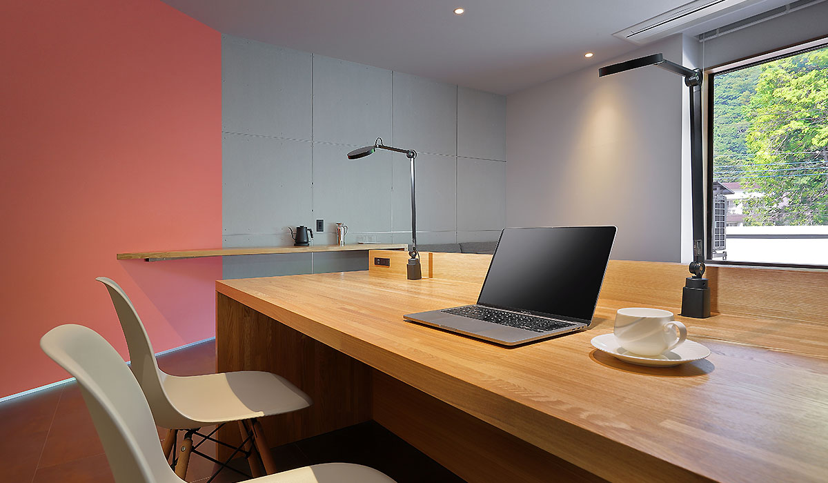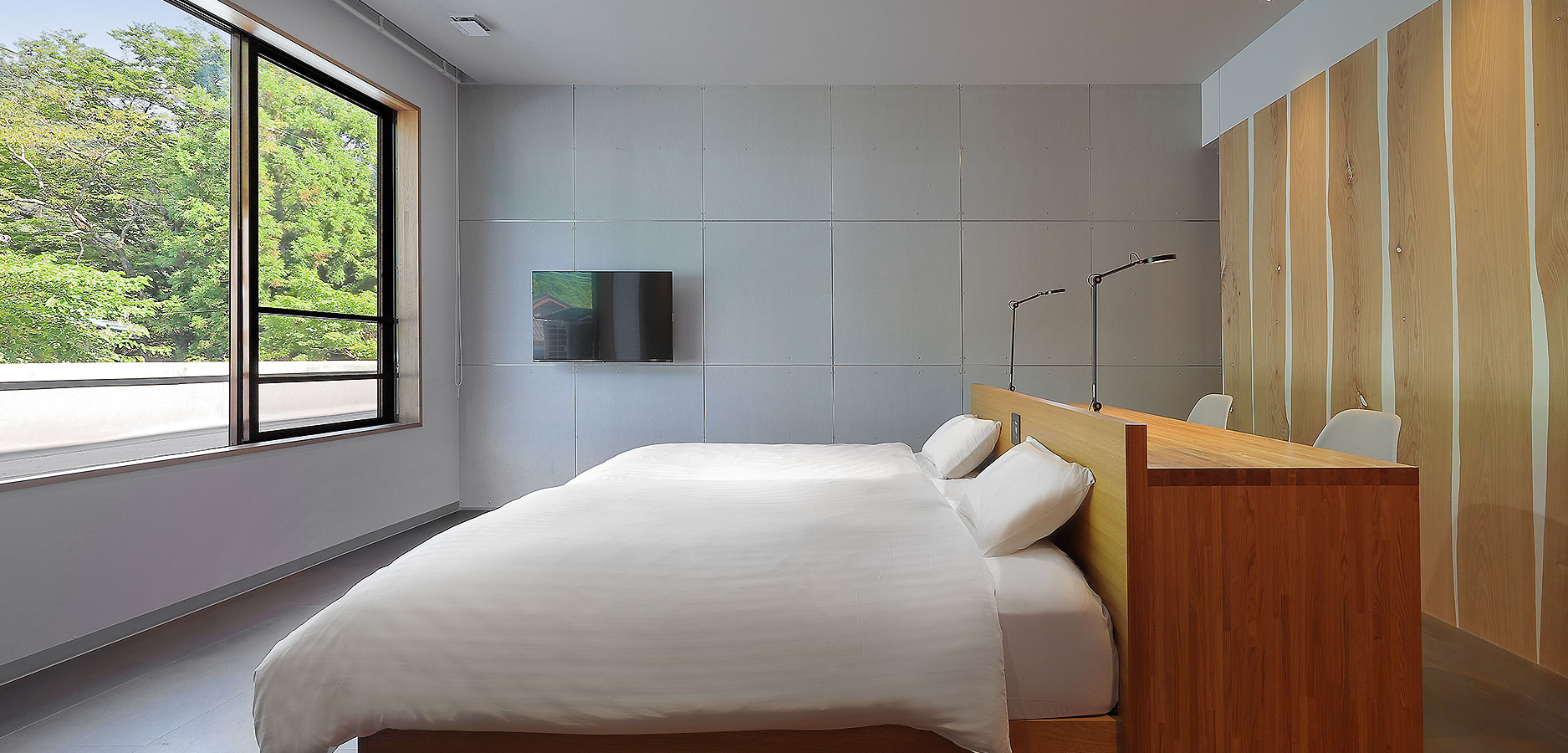 デスクとベッド、窓、テラスを一直線に並べ、四万の森を眺めるために設計された気持ちの休まるお部屋。バリアフリーに対応しておりますので、車椅子でもご利用いただけます。トイレとクローゼットも空間をゆったり使い、長期滞在にも対応できます。