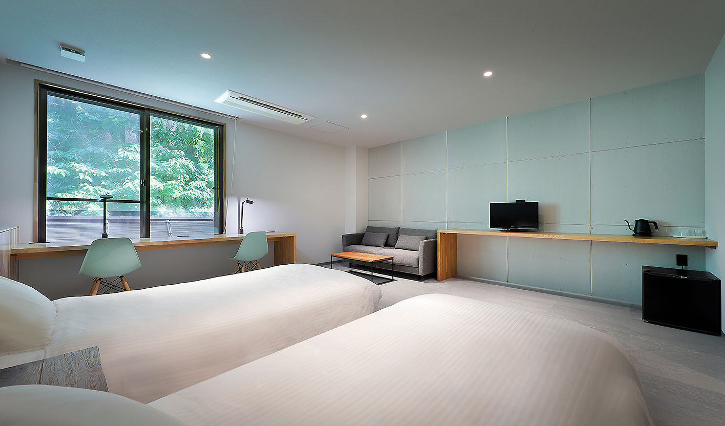 広々とした1ルームにツインベッドとソファー、カウンターデスクを備えました。4室あるフォレストルームの中でもこのAタイプの1室は壁一面の大きな窓が魅力。