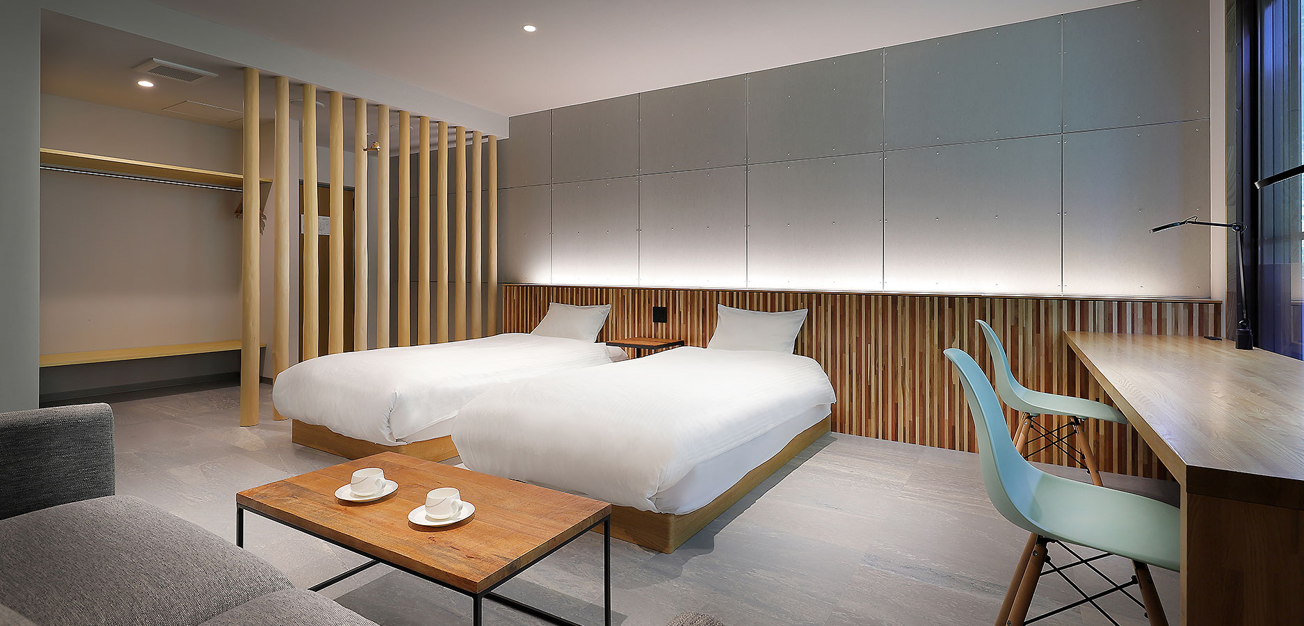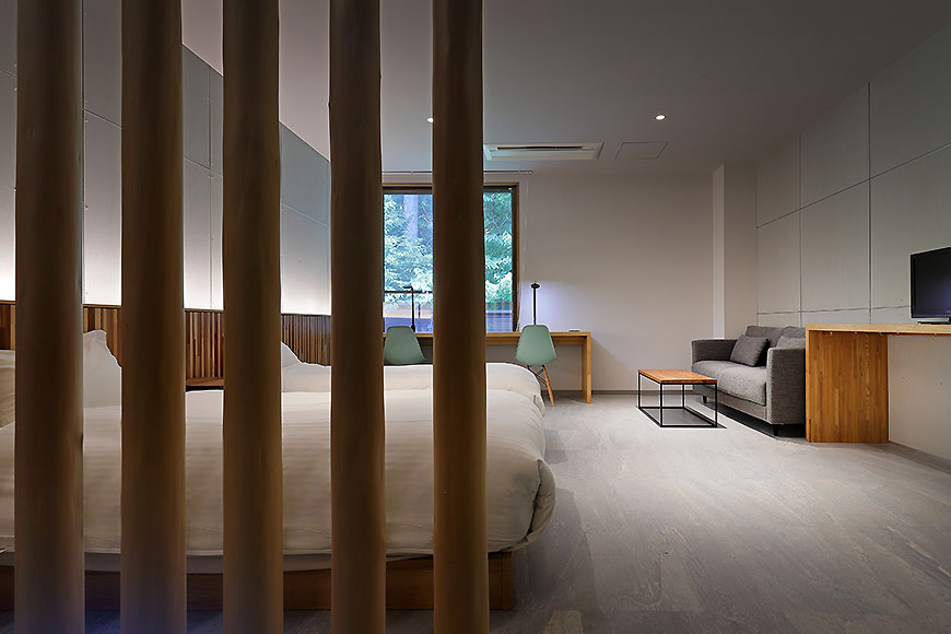 整然と並ぶ杉林が広がる四万の森をイメージした、シンプルなツインルーム。