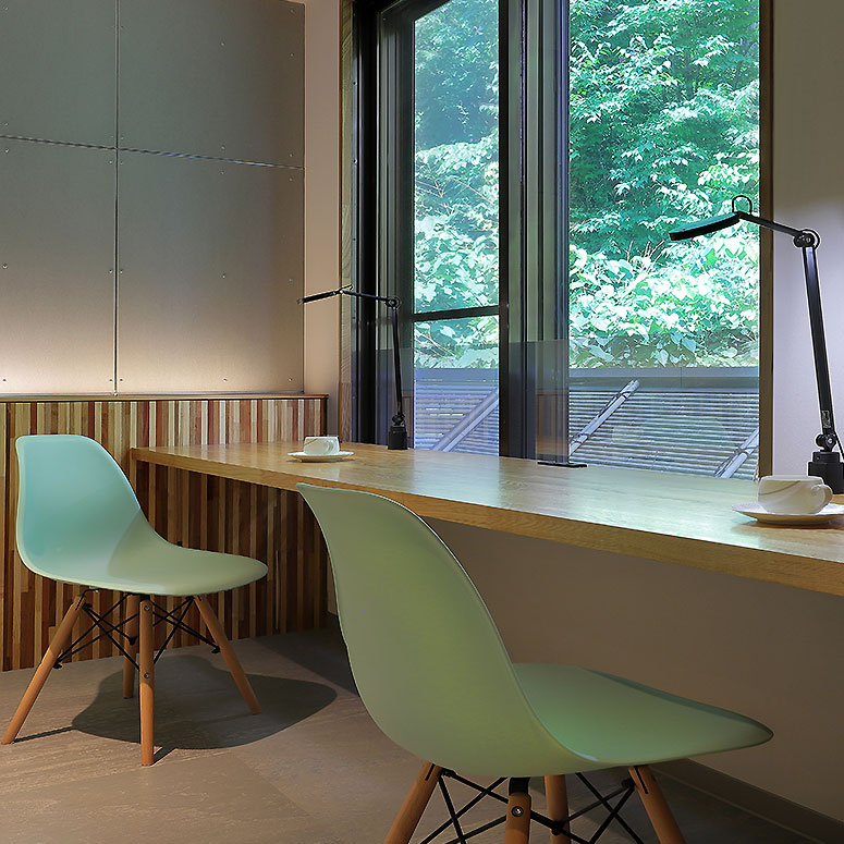 ミニマルデザインの中に”フォレスト”を感じていただける装飾をプラス。小鳥のさえずりがよく聞こえ、まるで小鳥の住処におじゃましているような感覚になります。室内にも木丸太を使ったデザインを取り入れ、部屋ごとに違う木彫りの小鳥が出迎えてくれます。