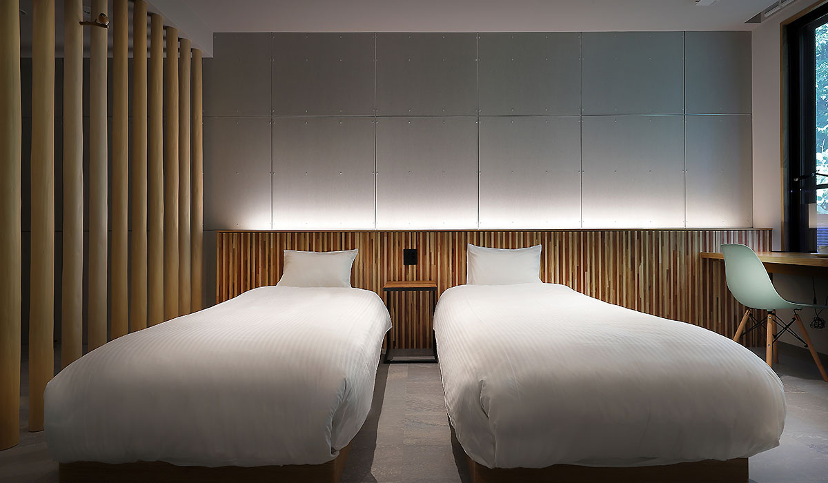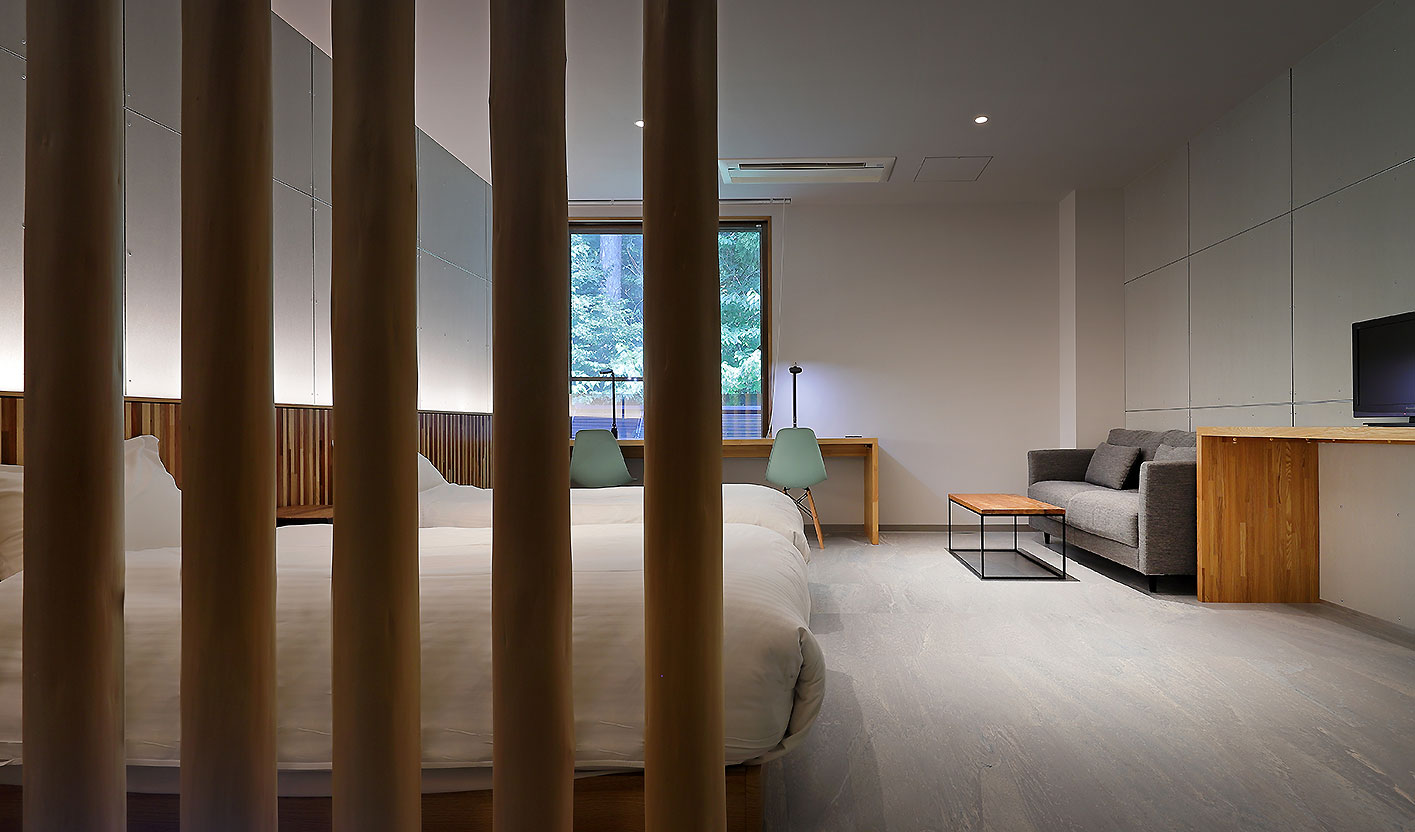 整然と並ぶ杉林が広がる四万の森をイメージした、シンプルなツインルーム。